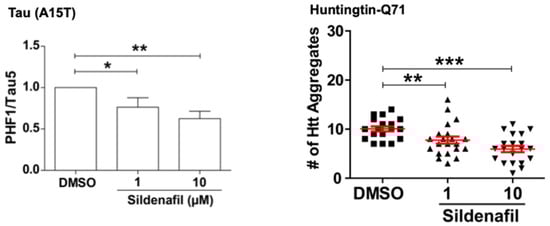 Raising cGMP levels promotes the clearance of mutant proteins in zebrafish models of a tauopathy and Huntington’s disease. (Left Panel) Zebrafish larvae expressing the tauopathy-associated A15T mutation in neurons were treated with sildenafil for 5 days. Their content of the hyperphosphorylated tau, expressed as a fraction of the total tau, was decreased, indicating selective degradation of the disease-associated species. (Right Panel) In zebrafish larvae expressing huntingtin with a 71-glutamine repeat in the retinal photoreceptor cells, sildenafil treatment for 5 days also reduced the number of huntingtin aggregates (adapted from [16]). (* denotes p < 0.05, ** p < 0.01, and *** p < 0.001).