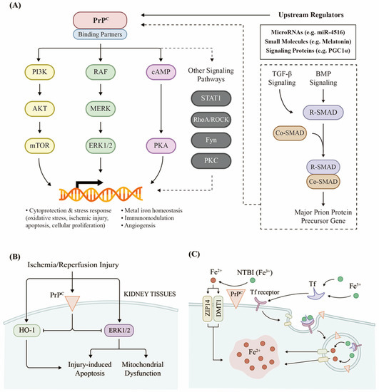Endogenous PrPC in the kidneys plays a role in cellular signaling processes to influence renal physiology. (A) PrPC mediates a variety of downstream signaling pathways via interactions with appropriate binding partners in kidney tissues. There are numerous PrPC-signaling pathways that are characterized in neuronal cells, and some of these have been cross-validated in the kidney, while others have not. The signaling proteins and interaction mechanisms that merit further validation in renal models are shown in grayscale or dotted lines. (B) PrPC has been associated with some protective functions against ischemic injury through affecting the ERK1/2 transduction pathway and heme oxygenase-1 (HO-1). (C) PrPC exhibits ferrireductase activity to promote the uptake of transferrin- (Tf) and non-Tf-bound iron (NTBI) by the kidneys. Fe3+ ions are bound to transferrin, which can enter proximal tubular cells. PrPC ferrireductase activity produces Fe2+, which can be released into the cytoplasm through DMT1 and ZIP14.