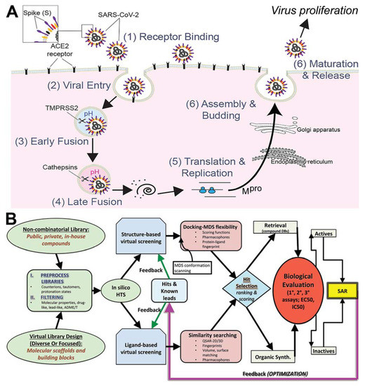 Here, we propose a combination small-molecule therapy for COVID-19 (antivirals). We aim to target the SARS-CoV-2 replication cycle at multiple levels to synergistically inhibit viral spread and dissemination. Using a computational pipeline that aimed to expeditiously identify lead compounds against COVID-19, we combined compound library preparation, molecular modeling, and structure simulations to generate an ensemble of conformations and increase high-quality docking outcomes against two essential SARS-CoV-2 viral proteins and their host protein interactions; S/ACE2, Tmprss2, Cathepsin L and K, and Mpro that are known to control both viral binding or entry and virus replication (Figure 1A). Our approach (Figure 1B) will most likely lead into experimental virus inhibition screening, structural characterization of binding interactions by X-ray crystallography, and compound safety profiling. Virtual screening (VS) is a rational driven controller for identification of new hits from compound libraries [29] using either ligand-based (LBvs) or structure-based (SBvs) virtual screening [30]. LBvs tactics use structural and biological data of known active compounds to select favorable candidates with biological activity from experiments [31,32]. SBvs approaches, on the other hand, examine quantitative structure–activity relationships (QSAR), clustering, pharmacophore and 3D shape matching [33]. The utility of VS is evident in the growth of our knowledge base of new compounds and existing drugs as well as the expansion of our structural databases. SBvs is generally the preferred approach when access to the target 3D information derived from NMR, X-ray crystallography or homology models [31,32] is possible. Molecular docking (docking) is the most common SBvs approach used today [34,35,36,37,38,39] and searches for the ideal position and orientation (called “pose”) of the small molecule within a target’s binding site, which gives a score for the pose. When including knowledge of experimentally known compounds (“actives”) from a 3D target, LBvs and SBvs can be combined to increase the likelihood of obtaining new actives from searches [40].