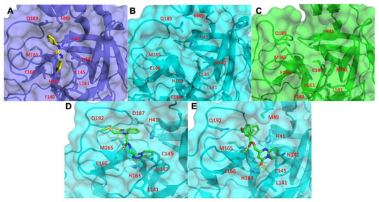 For the viral main proteinase, Mpro, a key enzyme for coronavirus replication (SARS-CoV-2), and a potential target for anti-SARS drug development, several peptidomimetics synthetized in early 2012 against SARS-CoV-1 proteases were identified as selective. There is a high degree of sequence identity between the SARS-CoV-1 and SARS-CoV-2 Mpro. This means that SARS-focused ligands could form similar interaction maps with Mpro protein and offers good launching points for 3D-QSAR/machine learning-driven drug design for future iterations. To perform the virtual screening, protein structure was taken from the PDB code 7BQY complex and significant attention was paid to the interaction between the crystallized ligand from the complex and protein-binding site [127] (Figure 6). As the binding site is quite large (Figure 6A) we used a set of additional crystal structures (PDB code 6Y2F/5R83 and fragment-like compounds from https://www.diamond.ac.uk/ (accessed on 22 May 2021)) to narrow the source of possible conformations. The binding of the compounds inserted into this region demonstrated a very canonic and recurring interacting motif, represented with α-Keto amide group flanked with aliphatic or saturated rings. We then performed molecular dynamics of 75 ns for the ligand-free dimer structure of the Mpro to evaluate and “catch” the most flexible elements of the binding site. Our simulation revealed that the extended binding pocket was not very stable, unlike its individual subpocket, which contains the catalytic dyad cysteine (C145) and histidine (H41), among other residues (Figure 6B,C). We began our molecular docking after assigning several combinations of constraints that should define specific interactions with the protein-binding site. We performed several high-throughput screening procedures using the same set of features in different combinations of constraints by partial matching algorithm (Figure 6D–E). We then ranged docking scores and compared obtained conformations inside the binding site with the co-crystalized ligands from 7BQY, 6Y2F structures to select the most potent compounds.