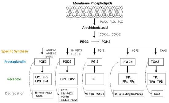 AA is a type of polyunsaturated fatty acid that exists as a membrane phospholipid on cells. AA is released through phospholipid hydrolysis by the phospholipase A2 (PLA2), phospholipase D, or phospholipase C pathways in response to cytokines, growth factors, and other proinflammatory stimuli [] and then is converted to PGs and leukotrienes by the cyclooxygenase (COX) and lipoxygenase (LOX) pathways, respectively. COX, also called PTGS or PGHS, catalyzes cyclooxygenase and endoperoxidase reactions, leading to the production of PGH2 from AA via PGG2. The generated PGH2 can be converted to PGE2, PGD2, PGI2, PGF2α, and thromboxane A2 (TXA2) by individual enzymes and isomerases [], including PGE synthase (PGES), PGD synthase (PGDS), PGI synthase (PGIS), PGF synthase (PGFS), and TXA synthase (TXAS), respectively [].