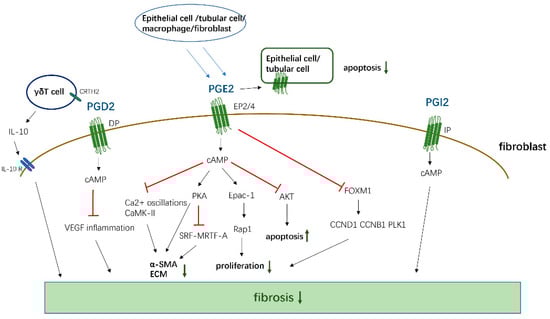 The antifibrotic effects of PGD2, PGE2, and PGI2. PGD2, PGE2, and PGI2 activate cAMP by binding to corresponding receptors, and then inhibit the proliferation, transformation, and ECM generation of fibroblasts, and promote cell apoptosis by affecting downstream signals. At the same time, PGD2 also acts on the CRTH2 receptor on γδT cell, promoting its release of anti-fibrosis IL-10 to inhibit fibrosis. PGE2 can act on EP2/4 receptors in epithelial cells and Tubular Cells in an autocrine way, thereby inhibiting the apoptosis of these functional cells.