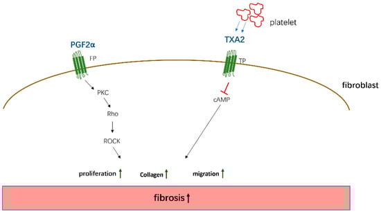 The pto-fibrotic effects of PGF2α and TXA2. PGF2α acts on the FP receptor on the surface of fibroblasts to induce cell proliferation and collagen expression by activating PKC/Rho kinase—ROCK (Rho-associated kinase) pathway. TXA2 secreted by platelets acts on TP receptors and promotes fibrosis by activating cAMP signaling.