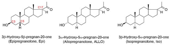 Structures of epipregnanolone (Epi), allopregnanolone (ALLO), and isopregnanolone (Iso). When the rings of a steroid are denoted as projections onto the plane of the paper, the α-substituent (hashed bond) is located below the plane, and the β-substituent (bold bond) above the plane of the paper. The important ring numbering positions are highlighted in red for epipregnanolone.