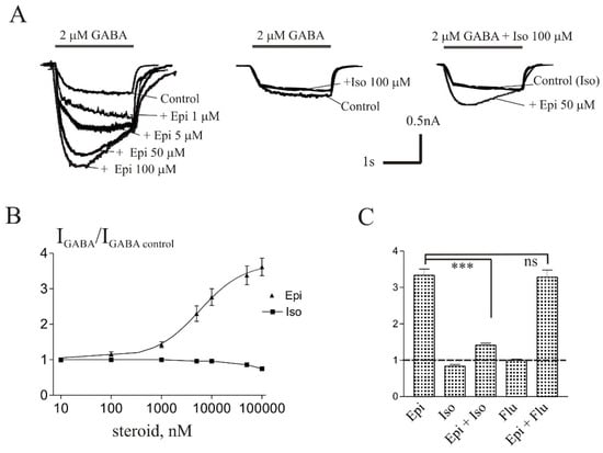 Steroids with pregnane skeleton were shown to be effective modulators of neuronal gamma-aminobutyric acid (GABAA) receptors [,]. The spatial arrangement of the hydroxyl group at C3 position of steroid skeleton (Figure 1) dramatically affects the biological properties of the steroids []. It has been shown that 3α-hydroxypregnanes (for example, allopregnanolone, ALLO,) potentiate the GABA-induced chloride current (IGABA) in nanomolar concentrations, while the 3β-hydroxy-pregnanes, i.e., epipregnanolone (Epi) and isopregnanolone (Iso) exhibit antagonistic properties and reduce the stimulating effect of 3α-hydroxypregnanes on IGABA []. However, note that the literature describing the effect of 3β-hydroxypregnanes on IGABA is controversial. The majority of studied 3β-hydroxy compounds were described to be effectively inert [,,]. In contrast, some 3beta-hydroxy compounds, including Epi, have been found to induce mild positive modulatory effects. For example, Wang et al. [] have found that IGABA recorded from recombinant GABAA receptors expressed in frog oocytes is potentiated by 30% in the presence of 10 µM Epi. Kokate et al. [] showed that IGABA in cultured hippocampal neurons was enhanced by 45% in the presence of 1 µM Epi. Strömberg et al. [] investigated the effects of the Epi and its interaction with ALLO by recording spontaneous inhibitory postsynaptic currents (sIPSCs) in rat hypothalamic neurons. Both ALLO (100 nM) and Epi (3 µM) produced a marked prolongation of sIPSCs decay. Co-application of ALLO and Epi induced a 20–25% reduction of decay. The authors concluded that Epi can act both as a positive and negative GABAA-receptor modulator. However, this conclusion is not confirmed by other authors, who did not find signs of positive modulation of the IGABA by Epi on the cells of the dorsal ganglia [], recombinant GABAA receptors [], and pituitary melanotrope cells []. The ability of Epi to positively modulate IGABA in native neurons has hardly been studied. The aim of this work was to study the effect of Epi on the IGABA on neurons isolated from rat cerebellum and hippocampus.