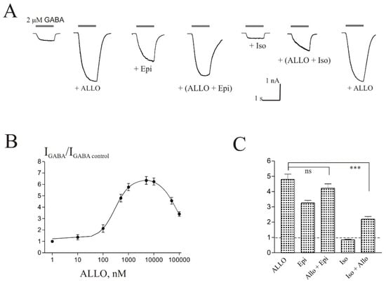 The effects of Epi and ALLO are not additive. (A) Representative traces of the current induced by 2 µM GABA in control and during co-application with 0.5 µM ALLO, 50 µM Epi, ALLO + Epi, 100 µM Iso, and ALLO + Iso. (B) Concentration dependence of ALLO effect on the normalized peak amplitude of IGABA. (C) Mean ± SEM of the normalized values of the peak amplitude of IGABA in the presence of ALLO (0.5 µM), Epi (50 µM), ALLO + Epi, Iso (100 µM), Iso + ALLO. The control value is indicated by a dashed line. Data points represent average from seven cells. *** Means p < 0.001, ns means not significant.