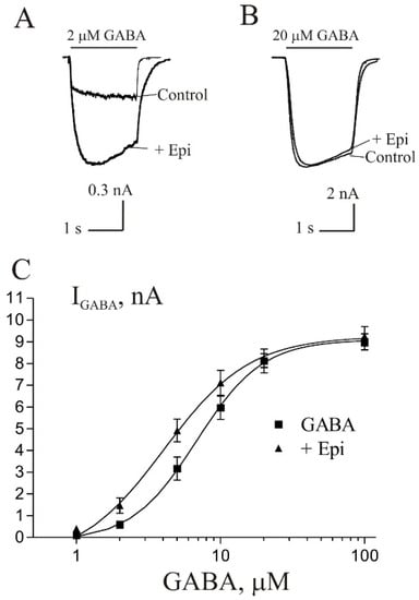 The degree of Epi effect depends on GABA concentration. (A,B) Representative traces of current induced by 2 µM GABA (A) and 20 µM GABA (B) in control and during co-application with 10 µM Epi. (C) Concentration–response curves for GABA obtained in control (squares) and in the presence of 10 µM Epi (triangles). Data points represent an average from six cells.