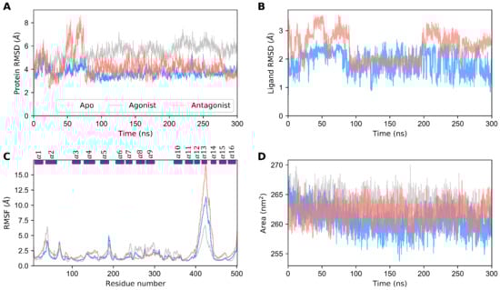 Similarly, root mean square fluctuations (RMSFs) were calculated for the Cα atoms of GDH states (Figure 1C). Interestingly, the α2 and antenna helices (α12, α13, and α14) show high residual fluctuations. In particular, the antenna helix protein segment showed the maximal residual fluctuations in all three GDH states, thus underscoring its large intrinsic domain movement due to the unusual long protruding geometry, which plays a key role in enzyme regulation [11,19,29]. The fluctuations of the antenna helix for the antagonist-bound state (~16.5 Å) were much higher when compared with the agonist- and apo forms. Furthermore, the helices participating in ligand binding were comparatively stable and sustained their residual variations within 1 Å. Highly fluctuating regions for ligand-bound states were similar; however, the residual RMSFs of the agonist-bound state were much smaller than those of the antagonist-bound state. In one specific region (i.e., the loop connecting α5 and α6), the residue fluctutations of the agonist form were higher than those of antagonist and apo forms, which correlates well with our correlation network analysis (see Section 3.4.). Besides the α2 and antenna helices, the apo form showed residual fluctuations in the α8 and α9 helices. In addition to the RMSD, SASA was used to evaluate the stability of GDH states. Figure 1D shows that the agonist-bound state’s SASA is lower than that of the antagonist- and apo states, thus depicting its thermodynamic stability. The apo form showed higher SASA when compared with the agonist and antagonist-bound states. The average SASA for the apo, active, and inactive GDH states was 263.221 nm2, 260.551 nm2, and 261.953 nm2, respectively. Interestingly, the SASA values among the three states showed only marginal differences. Overall, our SASA analysis showed that all the three states were highly stable and did not vary over the course of the simulation.