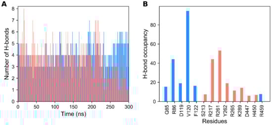 Besides the RMSD and SASA analyses, we also checked the stability of hydrogen-bonds (H-bonds) in the agonist- and antagonist-bound GDH states throughout the simulation. In Figure 2A, it can be observed that the number of H-bonds in the ligand-bound states varied throughout the course of the MD simulation. The average number of H-bonds per timeframe for the ligand-bound states were 3.482 and 4.118, respectively, for the agonist- and antagonist-bound states. The maximum number of H-bonds in ligand-bound states were, respectively, 7 and 8 for the agonist- and antagonist-bound states. Approximately three H-bonds were retained in the ligand-bound states throughout the simulations. Moreover, critical residues that were involved in H-bond formation for ligand recognition were identified using H-bond occupancy. H-bond occupancy can be defined as the fraction of time involved in H-bond formation between the ligand and protein atoms. In Figure 2B, it is shown that the Q85, R86, D119, V120, and F122 residues mainly contribute to H-bond formation in the agonist-bound state, which is in line with the previous reports [10]. Additionally, the R459 residue contributes minorly to H-bond formation, which plays an important role in ADP activation, as the mutant form of R459A leads to a loss in ADP activation [10,11]. However, in the antagonist-bound state, R217, R261, Y262, R265, and K289 are the major residues involved in H-bonding formation, which agrees with previous studies [10,11]. Other minor residues include S213, D447, and H450. In brief, H-bond analysis shows the prominence of polar interactions in the selective recognition of GDH ligands.