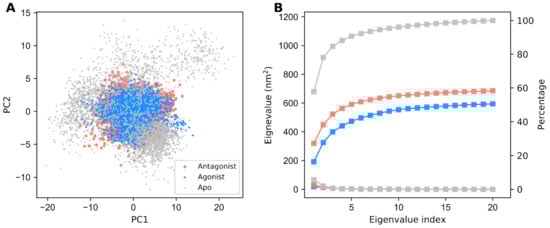Principal component (PC)1 and PC2 projections of the different structural conformations of GDH states. (A) Two-dimensional (2D) projection of PC1 and PC2 throughout the MD simulations for the apo, agonist-bound, and antagonist-bound GDH states, which are represented in gray, dodger blue, and salmon, respectively. (B) The best PCs of eigenvalues corresponding to the first 20 eigenvectors and their related cumulative fluctuations are represented by squares.