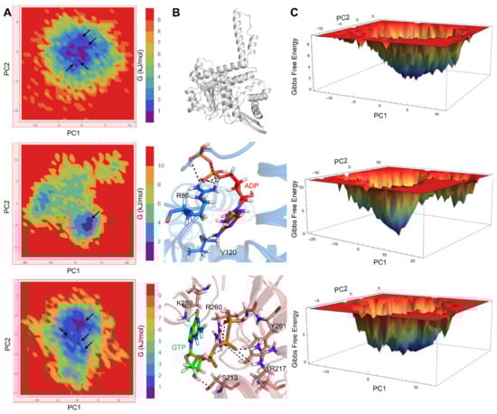 Free energy landscape (FEL) contour plots of GDH states. (A) Two-dimensional FELs of apo (top panel), agonist-bound (middle panel), and antagonist-bound (bottom panel) GDH states, shown as a function of two PCs that were selected based on a cosine content value ≤0.2. The minimal energy clusters in all three GDH states are shown by black arrows. (B) The minimal energy structures of apo, ADP-bound, and GTP-bound GDH states are shown. Residues critical for ligand recognition are depicted as blue and salmon-colored sticks and H-bonds are shown as black dashed lines. (C) Three-dimensional FEL plots of apo (top panel), agonist-bound (middle panel), and antagonist-bound (bottom panel) GDH states.