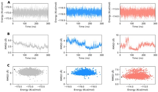PCA was used for reducing the dimensionality of the data while preserving most of the variation in the data [50]. Here, we utilized essential dynamics analysis (EDA) to study the distribution of the structural conformations among three different GDH states from the MD simulation trajectories. Two-dimensional projections of PC1 and PC2 between the largest two eigenvalues in the GDH states are mapped in Figure 3A. The conformation of each individual GDH state over a trajectory of 300 ns is represented by dots. Notably, if a protein showed large conformational changes, then the distribution was also scattered in the conformational space. In our EDA analysis, the apo form’s distribution is more widely dispersed than ligand-bound forms due to the absence of a ligand. However, the distribution of GDH ligand-bound states in the conformational space is limited.