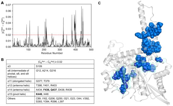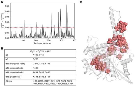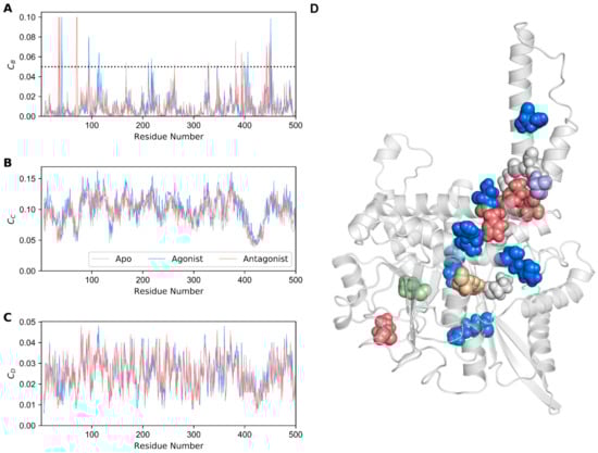 Additionally, we computed the differences in CB between the apo and agonist-bound (Figure 7A), and the apo and antagonist-bound states. In total, 28 residues that satisfied |CBApo − CBAgo| ≥ 0.02 were identified (Figure 7B) and mapped onto the minimal energy structure of the apo form (Figure 7C). In Figure 7B,C, it is clear that the residues satisfying the condition |CBApo − CBAgo| ≥ 0.02 are primarily distributed in the α3, α6, α11, α12, α14, and α15 alpha helices. Besides the helices, a few of the residues are well dispersed in the loop regions, mostly in the α11–α12 loop.