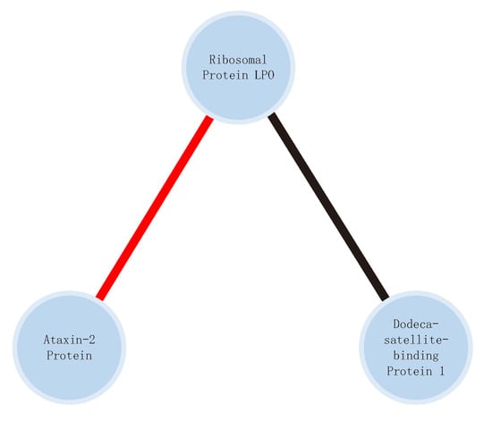 For example, we can learn from the Drosophila melanogaster signed PPI database [29] constructed by Arunachalam V et al. that the interaction between Ribosomal protein LP0 (FlyBase ID: FBgn0000100) and Ataxin-2 protein (FlyBase ID: FBgn0041188) is positive; however, the interaction between Ribosomal protein LP0 and Dodeca-satellite-binding protein 1 (FlyBase ID: FBgn0027835) is negative. Thus, the PPI signed network comprising the Ribosomal protein LP0, Ataxin-2 protein, and Dodeca-satellite-binding protein 1 can be represented as shown in Figure 1. The signed PPI database is available online (https://www.flyrnai.org/SignedPPI/Download.jsp, accessed on 25 January 2021).