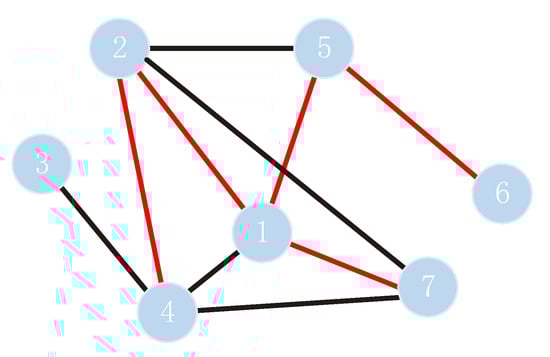 To define and explain the adjacency matrix A of the PPI signed network more intuitively, we selected seven protein nodes in a PPI network as an example and label these nodes with serial numbers. Simultaneously, we selected part of the edges between these protein nodes to form the PPI signed network (Figure 2). Adjacency matrix A is defined in Equation (1), and the adjacency matrix corresponding to Figure 2 is expressed by Equation (2). Here, the link sign prediction task must replace the unknown zeros in the adjacency matrix with the predicted signs.
