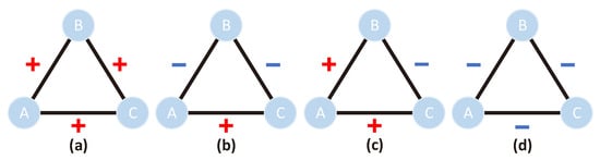 According to the structural balance theory, if the product of the signs on the three edges of a triangle is positive, the triangle is structurally balanced; otherwise, it is unbalanced. Here, if we use “+” to represent positive edges, i.e., the positive relationship between two nodes, and “−” to represent the negative edges, i.e., the negative relationship between two nodes, then the structural network of the two triangles in Figure 3a,b is balanced. In contrast, the triangular structural networks in Figure 3c,d are unbalanced. Here, it is worth noting that there are times when the balance theory does not hold in real life, such as G-proteins, which play the role of molecular switches in the process of signal transduction. G-proteins do physically interact with several other proteins, but these proteins do not interact directly. Therefore, this paper states that balance theory has some limitations in specific biological networks. However, in a broad sense, in real life, compared with unbalanced triangles, there are more balanced triangles [30]. In addition, the balance theory has achieved remarkable results in our method. Therefore, we carefully considered balanced triangles in our test.