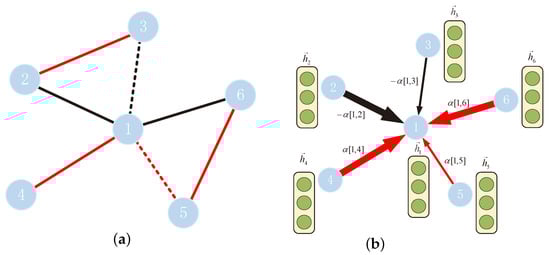 In the PPI signed network shown in Figure 4a, the solid line represents the first-order neighbor, and the dotted line represents the second-order neighbor. If the value of m in the above definition is 2, the update rule of node 1 is shown in Figure 4b. Here, node 1 is affected by its first- and second-order neighbors. The thickness of the arrow represents the relative size of the attention weight. Note that attention is used to aggregate the neighbor nodes to update node 1.