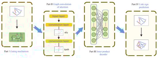 In part II, we considered as the adjacency matrix used by the model. Here, 0 in represent boundless and a non-zero value represents an edge. The model assigns an attention coefficient to all edges. The role of is to modify and update these attention coefficients such that attention follows the following rules: positive edges are positive, negative edges are negative, low-order neighbor high attention, and high-order neighbor low attention. With these definitions, we employed two convolutional layers to train the node vector’s feature representation. Finally, we added a nonlinear activation function layer, wherein the nonlinear activation function is a hyperbolic tangent function (tanh). We obtained the feature representation of each node through these layers, which forms the input for part III.