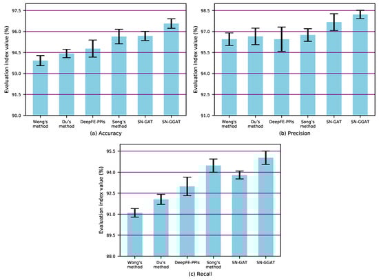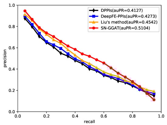 We took the average value of ten results, drew the average curve of PR, and compared it with DPPIs [28], DeepFE-PPIs [23], and Liu’s method [27]. The comparison results are shown in Figure 10. DPPIs uses a convolutional neural network combined with random projection and data expansion to predict PPIs, and its auPR value is 0.4127. DeepFE-PPIs employ a new residue representation called Res2vec, which provides effective input for the downstream deep learning model. The auPR value of this method is 0.4273. Liu’s method uses GCNs to learn the location information of proteins in a PPI network and combines the sequence and location information of amino acids to generate strong protein characterization, with an auPR value of 0.4542. The SN-GGAT method has the best performance, and the auPR value is 0.5104, which is higher than the other three methods.