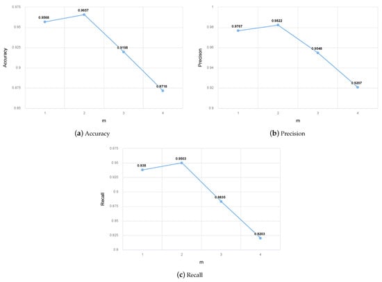 In our algorithm, the most important hyperparameter is parameter m of the gating mechanism (the order m of the accessibility matrix). After conducting nearly twenty tests, we found that when , the result obtained using the second-order memory accessibility matrix and second-order attention accessibility matrix was excellent. The test results obtained by considering different values of m are shown in Figure 8a–c.