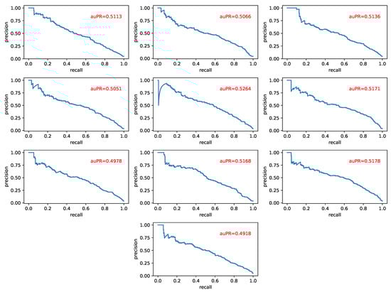 We predicted the link of the signed network composed of human protein and evaluated the model by using the value of auPR, where auPR refers to the area under the PR (precision-recall) curve. The higher the value of auPR, the better the performance of the model. We performed 10-fold cross validation on the Human dataset, and the test results are shown in Figure 9.