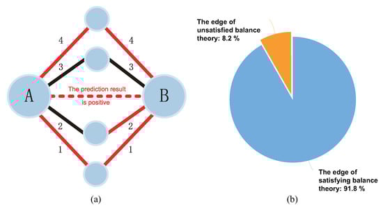 By analyzing the prediction results, we found that most of the predicted interactions satisfy the balance theory in the entire signed network. The explanation of satisfying the balance theory is shown in Figure 11a, and the analysis result is shown in Figure 11b.