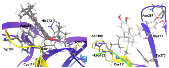 In preparation for normal docking and covalent docking, the co-crystallized ligands in SARS CoV-2 (PDB id: 6WUU) and OTUB2 (PDB id: 5QIY) were removed. For OTUB1, the PDB entry 2ZFY was used. Both refer to apoprotein structures in the absence of ubiquitin. The active sites of these OTU deubiquitinases show the conserved catalytic triad, which is also present in the PLpro (Cys-His-Asp/Asn) (Figure 1).