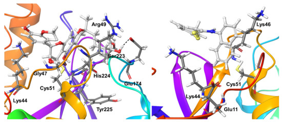 The fifth complex (PDB id: 5QIT) with the compound PCM-0102821 (N-[(E)-(3-methylphenyl) methylidene] acetamide) displayed a rotation of the solvent-exposed phenyl ring. In this complex, we can identify that Arg49 and Ser223 formed hydrogen bond interactions with ligand atoms for more than 95% of the simulation time with a ligand RMSD of around 1 Å (Table S1). Cys51 and Asp48 showed interactions for nearly 35% of the simulation time (Figure S5).