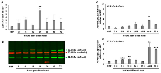 Midguts were dissected on ice from female A. stephensi prior to blood feeding (NBF) and 2, 6, 12, 24, 36, 48, and 72 h post-blood meal in PBS with 1X protease inhibitor and the blood bolus removed. Ten midguts were pooled and transferred to 25 µL of protease inhibitor (5X) solution with an equal volume of cell lysis buffer (1X PBS, 1% Triton X-100, 12 mM sodium deoxycholate, 2% SDS) and 25 µL of Laemmli sample buffer (50 mM Tris-HCl pH 6.8, 10% glycerol, 2% SDS, 0.2 mg/mL bromophenol blue, 0.1 M dithiothreitol). Lysed tissues were homogenized, denatured at 95 °C for 10 min, and centrifuged at 14,000× g for 5 min at room temperature. The supernatants were transferred to sterile microcentrifuge tubes and stored at −80 °C. For each protein sample, a single midgut equivalent was loaded onto precast 12% SDS-PAGE gels (NuSep, Germantown, MD, USA) with PageRuler™ Prestained Protein Ladder (Thermo Scientific, Waltham, MA, USA) as a molecular marker. Size-fractionated proteins were transferred to nitrocellulose membranes (LI-COR, Lincoln, NE, USA) for 1 h at 100 V. Membranes were blocked in non-fat milk (4% w/v) in 1X PBS (pH 7.4) for 1 h at room temperature, then incubated with 1:1000 A. stephensi PanK polyclonal antibody and 1:1000 alpha-tubulin monoclonal antibody (Developmental Studies Hybridoma Bank, Iowa City, IA, USA) in PBST (1X PBS with 0.1% Tween 20, Sigma, St. Louis, MO, USA) with non-fat milk (4% w/v) overnight at 4 °C. Following primary antibody incubation, membranes were washed ten times, 5 min each with 1X PBST, then incubated with secondary antibodies goat anti-rabbit 800 CW (1:10,000, LI-COR, Lincoln, NE, USA) and goat anti-mouse 680 RD (1:10,000, LI-COR, Lincoln, NE, USA) in PBST for 1 h at room temperature. The membranes were washed an additional ten times, 5 min each with PBST. A LI-COR imaging system with Image Studio software was used to acquire membrane signals. Densitometry quantification of protein bands was performed using ImageJ (NIH) as previously described [18].