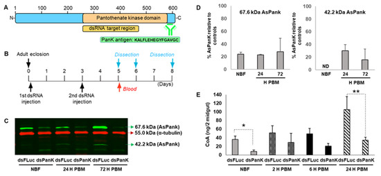 A. stephensi PanK RNAi reduced midgut PanK protein and coenzyme A (CoA) levels. (A). Schematic of A. stephensi PanK indicating the target location of the dsRNA construct and the peptide sequence used to generate the custom polyclonal antibody. (B). Experimental design for RNAi assays. A. stephensi females were injected with dsRNA targeting A. stephensi (dsPanK) or firefly luciferase (dsFLuc) within 4 h after adult eclosion and again at 3 d post-emergence. Mosquitoes were provided human blood on day 5 and midguts were dissected prior to blood feeding (non-blood-fed, NBF) and at 24 h and 72 h post-blood meal (PBM). (C). Representative immunoblot showing putative A. stephensi PanK isoforms (67.6 kDa and 42.2 kDa; green bands) following PanK RNAi relative to FLuc RNAi control (red band). Each lane represents one midgut equivalent from pools of ten mosquito midguts. RNAi and immunoblots were replicated twice with distinct cohorts of mosquitoes. (D). Densitometry analysis of the 67.6 kDa and 42.2 kDa A. stephensi PanK isoforms. Bars represent mean and standard deviation of percent PanK protein expression in mosquitoes inoculated with dsPanK relative to mosquitoes injected with dsFLuc. (E). Midgut CoA levels in dsPanK- and dsFLuc-treated A. stephensi. Differences between treatment groups for respective timepoints were evaluated using Student’s t-test. ** p < 0.01 and * p < 0.05. Experiments were replicated three times with independent cohorts of mosquitoes.