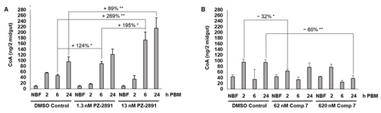 Based on these observations, we provisioned PZ-2891 (1.3 nM, 13 nM) and compound 7 (62 nM, 620 nM) to female A. stephensi in a meal of human blood delivered by artificial feeder. Both concentrations of PZ-2891 resulted in significantly increased midgut CoA levels at 6 h after the blood meal, with sustained effects of 13 nM PZ-2891 through 24 h and a pattern of greater increases in midgut CoA for 13 nM vs. 1.3 nM PZ-2891 at 6 h and 24 h (Figure 4A). In contrast, 620 nM compound 7 significantly reduced CoA levels at 24 h post-feeding relative to control, while 62 nM significantly reduced CoA at 2 h post-feeding relative to control (Figure 4B).