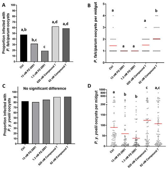PZ-2891 and compound 7 decreased and increased, respectively, P. y. yoelii 17XNL and P. falciparum infection of A. stephensi. Graphs A and C represent infection prevalence for P. yoelii and P. falciparum, respectively, while B and D show infection intensity. Prevalence data (A,C) were analyzed by Chi-square and Fisher’s exact tests and infection intensity data (B,D) were analyzed by one-way ANOVA and Tukey’s post hoc test. Different lower case letters above data columns indicate groups that are significantly different by Chi-square (graphs A,C) or ANOVA and Tukey’s (graphs B,D) at the α = 0.05 level of significance (i.e., data indicated as “a” are significantly different from data indicated as “b” within a single graph). (A). P. falciparum infection prevalence. Specific p-values for significant differences are as follows: Control (Ctrl) vs. 1.3 nM PZ-2891 p = 0.0073; 13 nM PZ-2891 vs. 620 nM compound 7 p = 0.0009; 13 nM PZ-2891 vs. 62 nM compound 7 p = 0.0022; 1.3 nM PZ-2891 vs. 620 nM compound 7 p < 0.0001; 1.3 nM PZ-2891 vs. 62 nM compound 7 p = 0.0001. Two biological replicates were performed with unique cohorts of mosquitoes (n = 28–30 mosquitoes per control and treatment groups). (B). P. falciparum infection intensity. Numbers of oocysts per midgut of individual female A. stephensi mosquitoes infected with P. falciparum are represented by black circles. Red bars represent mean oocysts/midgut. Specific p-values for significant differences are as follows: Ctrl vs. 62 nM compound 7 p = 0.0266; 13 nM PZ-2891 vs. 62 nM compound 7 p = 0.0004; 1.3 nM PZ-2891 vs. 62 nM compound 7 p = 0.0051; 620 nM compound 7 vs. 62 nM compound 7 p = 0.0424. (C). P. yoelii prevalence. No significant differences were observed among groups, likely due to the high infection prevalence overall. Three biological replicates were performed with unique cohorts of mosquitoes (n = 70–88 mosquitoes per group). (D). P. yoelii infection intensity. Numbers of oocysts per midgut of female A. stephensi mosquitoes infected with P. yoelii. Red bars represent mean oocysts/midgut. Specific p-values for significant differences are as follows: Ctrl vs. 13 nM PZ-2891 p = 0.0164; Ctrl vs. 1.3 nM PZ-2891 p = 0.0003; Ctrl vs. 620 nM compound 7 p = 0.055; 13 nM PZ-2891 vs. 620 nM compound 7 p = 0.0009; 13 nM PZ-2891 vs. 62 nM compound 7 p = 0.0081; 1.3 nM PZ-2891 vs. 620 nM compound 7 p < 0.0001; 1.3 nM PZ-2891 vs. 62 nM compound 7 p < 0.0001.