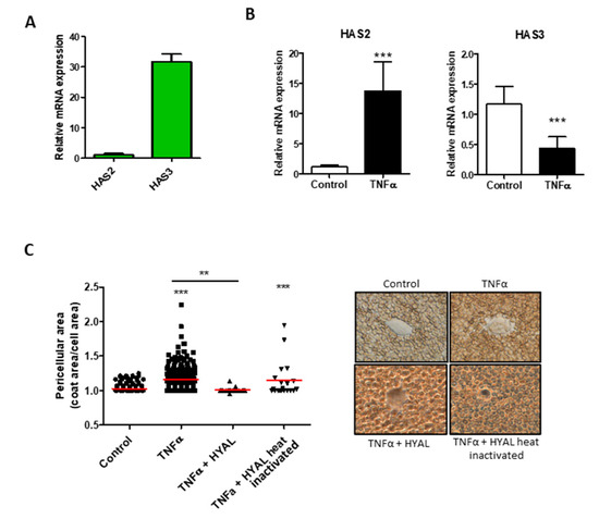 Effect of TNF-α on Hyaluronan synthesis in HUVEC. (A) HASs expression profile in HUVEC. The reference gene used for normalization was β-actin and the normalizer HAS2 expression. (B) Relative expression of HAS2 and HAS3 after TNF-α stimulation (24 h). The reference gene used for normalization was β-actin and the normalizer untreated samples. Data are mean ± S.E.M. of four independent experiments, *** p < 0.001. (C). Particle exclusion assay performed on HUVEC untreated (control) and under TNF-α stimulation for 24 h. To clarify the HA composition of the pericellular matrix, we digested HA with 2 U/mL of Hyaluronate Lyase from Streptomyces hyalurolyticus (HYAL) before the addition of erythrocytes. Original magnification 40×. Values represent the measure of the single cell pericellular area, and the red bars are the mean of three independent experiments, *** p < 0.001 and ** p < 0.01.