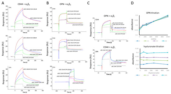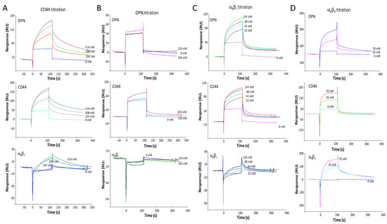 Due to surface plasmon resonance being a method for the rapid assessment of molecular interactions, we first assessed binding with this tool. The extracellular portion of CD44v bound to immobilized OPN. Its binding to integrin α9β1 was low. CD44v in the flow also bound to immobilized CD44v (Figure 1A). This is consistent with a literature report that variant, but not standard CD44 can aggregate [11], which is consistent with these surface plasmon resonance results (see also Supplementary Figure S1). As was described in the original report [8], the interaction between OPN and CD44 is independent of glycosylation (both proteins used here are bacterial recombinant products). GST-OPN in the flow did not bind to immobilized GST-OPN or to immobilized α9β1. Unexpectedly, it showed only low-level binding to immobilized CD44v (Figure 1B). This suggested that OPN requires some structural constraint (as it is exerted by immobilization on the SPR chip) for engaging CD44. Separately, the integrins α9β1 or αVβ3 in the flow were assessed for binding to immobilized OPN, immobilized CD44v extracellular domain, or immobilized α9β1 extracellular domain (Figure 1C,D, see description below).