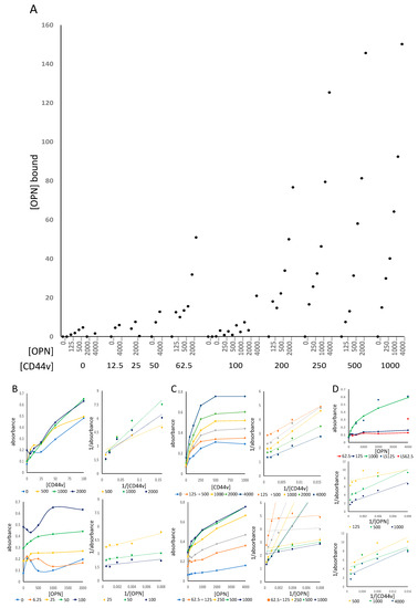 We expanded the measurements to a receptor-ligand ELISA format, where CD44 was immobilized on a high-binding 96-well plate and GST-OPN was added at various concentrations, followed by detection with a HRP-anti-GST epitope tag antibody, which does not interfere with the interactions among the binding partners. The color development of the detection reagent TMB was assessed. The titration of both, OPN and CD44v, resulted in increasing absorbance (Figure 2A). At low concentrations (CD44v 0–100 ng/well, GST-OPNa 0–2000 ng/well), CD44v titrated dose-dependently whereas OPN displayed absorbance increases only at the more elevated doses in the chosen range (Figure 2B). At high concentrations (CD44v 0–1000 ng/well, GST-OPNa 0–4000 ng/well), CD44v titrated saturably (Figure 2C) and could be converted to linear double-reciprocal plots. OPN bound dose-dependently; remarkably the double-reciprocal plots and the Scatchard plots (not shown) consistently displayed curved lines, suggesting the possibility of either two binding sites with distinct affinities or two binding conformations. Notably, OPN binding to a truncated version of CD44v (MyBiosource, San Diego, CA, USA, alignment in Supplementary Figure S1) appeared to have about 8-fold lower affinity (overlapping dose-response curves for osteopontin binding to 125 ng/well LSBio CD44v and 1000 ng/well MyBiosource CD44v) suggesting that the binding domain on CD44 entails and extends beyond the truncated version (Figure 2D).