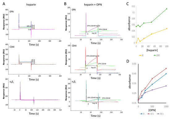 Heparin facilitates OPN binding to CD44 in surface plasmon resonance experiments. In a BIACORE 2000 instrument, the four channels of a CM5 chip were coated with bovine serum albumin (negative control), GST-OPN, CD44v, or Integrin α9β1: (A) Low levels of heparin binding alone to immobilized OPN (top), CD44v (middle), or α9β1 (bottom); (B) Binding of heparin, OPN or both in the flow to immobilized OPN (top), CD44v (middle), or α9β1 (bottom); (C) Heparin effect on OPN-CD44v binding in ELISA; (D) OPN binding to CD44v in ELISA, following preincubation with heparin for 2 h at the indicated ratios.