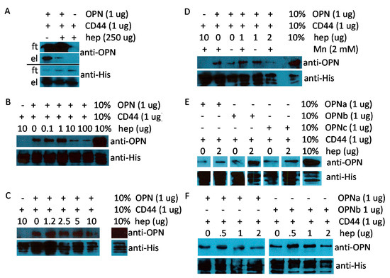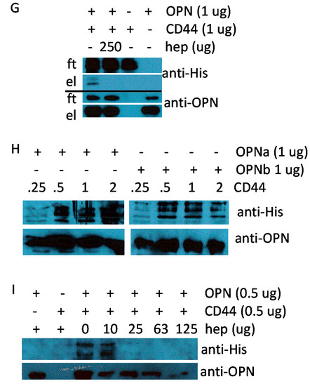 Pull-down of OPN or CD44 after binding. Binding was assessed between GST-OPN and the extracellular domain of CD44v. Following resolution of the proteins on 10% SDS-PAGE and Western blotting, the signal for OPN was detected by probing with antibody O-17, and the signal for CD44v was detected by probing with anti-His-tag antibody. Each subfigure shows the results from one experiment and one gel: (A–F) Pull-down of the extracellular CD44v domain with nanoCLAMP resin; (A) Flow-through and eluate of OPN and CD44v in the presence or absence of 250 μM heparin. ft = flow-through, el = elution. One representative experiment of two (the densitometry results are shown in Supplementary Figure S4); (B) OPN and CD44v binding under titration of heparin (0–100 μM). One representative experiment of two; (C) OPN and CD44v binding under titration of heparin (0–10 μM); (D) Heparin at 0, 1, or 2 μg in the presence or absence of 2 mM manganese chloride (Mn); (E,F) Binding of OPN splice variants (GST-OPNa, GST-OPNb, GST-OPNc) to CD44v in the presence or absence of heparin (0–2 μM); (G–I) Pull-down of OPN with GSH-resin; (G) Flow-through and eluate of OPN and CD44v in the presence or absence of 250 μM heparin. ft = flow-through, el = elution; (H) CD44v titration (0.25–2 μg) to GST-OPNa or GST-OPNb (1 μg) in the absence of heparin. One representative experiment of two; (I) OPN and CD44v binding under titration of heparin (0–125 μM).