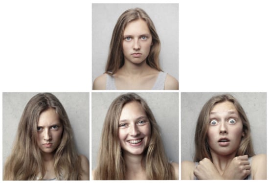 Most contemporary theories of emotion are based on the assumption that emotions are biologically determined [3]. Consistent with this biological approach is the finding that some basic, primary emotions, such as anger, fear, joy, sadness, disgust, and surprise, are innate, expressed in the first six months of life, and associated with specific facial expressions. As such, they have been equally recognized in different cultures around the world [5]. According to Ekman and others, different facial expressions of primary emotions are interpreted and reproduced similarly across different cultures [6,7]. Although people in different cultures are relatively equally successful at recognizing facial expressions of basic, primary emotions [5], estimating the intensity of these expressions, however, depends on the cultural context [8]. An illustration of facial expressions of the three primary emotions is shown in Figure 1.