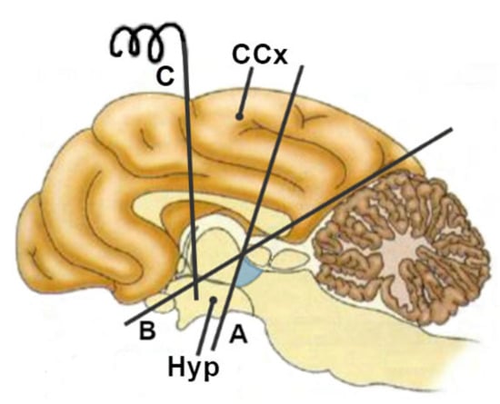In experiments observing the behavior of decorticated cats (“acute thalamic cats”), Cannon and Bard observed that these cats had a tendency to attack all objects in their immediate environment furiously and unreasonably, while increasing sympathetic activity yielded tail wagging, violently alternating leg twitching, back bending, claw scratching, and biting. Because such activity occurred in the absence of an externally evoked experience of anger, and could be provoked by the slightest stimulus, such as a light touch, Cannon and Britton called such behavior “a sort of sham anger/sham rage” [34]. Based on these experiments, it was hypothesized that the thalamus is responsible for expressing emotions in response to a stimulus and that the cerebral cortex inhibits the expression of emotions [35,36,37]. Further studies refuted this theory, including the importance of the thalamus in experiencing emotions. Even Bard himself in 1928 concluded that the “false rage” in cats does not occur if the cutting line by which decortication is performed goes from the posterior part of the cerebral cortex to the the anterior (line B in Figure 2), and not the posterior, hypothalamus (line A in Figure 2; in both cases a part of the thalamus is removed, Figure 2), a finding that was also confirmed by his experiments with the direct stimulation of the hypothalamus (electrode C in Figure 2) [35,36,37,38].
