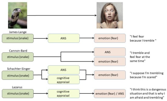 Simplified schematic representation of classical theories of emotion. Photographs taken from [9,48]. ANS—autonomic nervous system. See text for details.