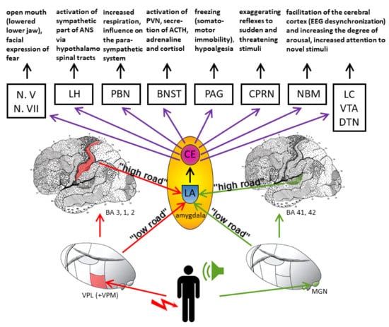 Simplified schematic representation of neural circuits underlying fear conditioning. Pathways that process a conditioned stimulus (CS, auditory pathway, green) and an unconditioned stimulus (US, spinothalamic anterolateral pain pathway, red) via the ventroposterolateral (VPL) and ventroposteromedial (VPM) nuclei and the medial geniculate body (MGN) of the thalamus monosynaptically, and via the cerebral cortex of Brodmann’s areas 3, 1, and 2 (primary somatosensory cortex); 41 and 42 (primary auditory cortex) polysynaptically converge on the lateral nucleus of the amygdala (LA, the LA receives the majority of afferent fibers). CS-US convergence in LA initiates long-term potentiation (LTP), leading to the creation of a learned association between the two stimuli. LA activity is then transferred to the central nucleus (CE, the central nucleus of the amygdala), which sends most of the efferent projections to a number of different cortical and subcortical areas through which the amygdala directly regulates autonomic responses and context-dependent behavior: ANS, reflexes, and hormone secretion. Sympathetic activation includes mydriasis, tachycardia, hypertension, peripheral vasoconstriction, cessation of peristalsis, sphincter contraction, and other effects. All these effects help organisms to cope with threat. Synaptic plasticity also changes in neurons in other nuclei of the amygdala (intentionally omitted here). ACTH—adrenocorticotropic hormone; BA—Brodmann’s area; BNST—bed nucleus of stria terminalis; CPRN—caudal pontine reticular nucleus; DTN—dorsal tegmental nucleus; EEG—electroencephalogram; LC—locus coeruleus; LH—lateral hypothalamus; MGN—medial geniculate nucleus; NBM—nucleus basalis Meynerti; N. V—trigeminal nerve; N. VII—facial nerve; PAG—periaqueductal gray; PBN—parabrachial nuclei; PVN—paraventricular nucleus; VPL and VPM—ventroposterolateral and ventroposteromedial thalamic nuclei; VTA—ventral tegmental area. The schematic is made according to LeDoux [73,74].