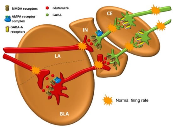 The balance between excitation and inhibition determines the overall degree of amygdala excitability. The BLA complex consists of 80% pyramidal, glutamate neurons, while 20% are GABAergic [111]. Although GABAergic neurons are fewer in number, they normally exert effective control over excitatory neurons and modulate the response to anxiogenic stimuli (see below) [129,150]. The balance between excitation and inhibition thought to be present in a healthy person under non-threatening circumstances is shown in Figure 8.