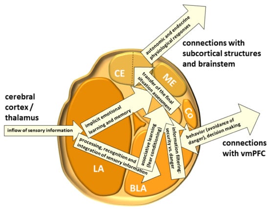 A simplified flow of information through the amygdala from the neuroanatomical perspective is schematically shown in Figure 7.