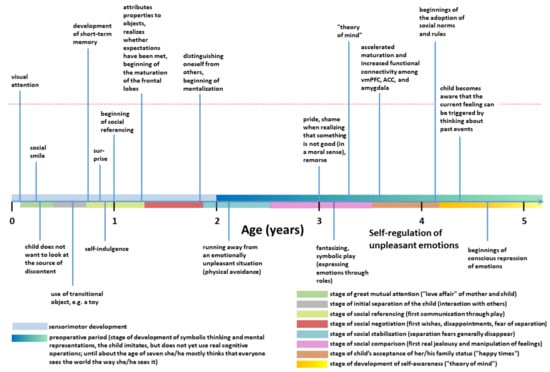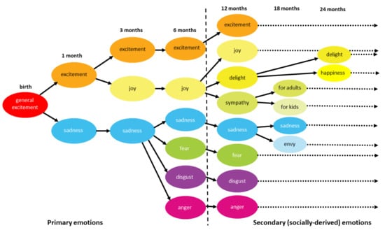 Further perinatal and postnatal developmental changes of the amygdala are associated with the establishment of structural and functional frameworks and continue to the age of 2 years [202]. The majority of connections are formed or have already been completed at birth, and the pattern of functional development of resting-state default-mode networks follows myelination and maturation [203]. It should be noted that the strong growth of cortical and subcortical gray matter occurs during the first year of life although the cortex matures later [204,205], and the further development of the amygdala, as well as the entire central nervous system, is mainly marked by reorganization, fine-tuning, and reshaping of already-established neural circuits [206]. The ontogenesis of individual primary and secondary emotions in the first two years of life is shown in Figure 11. As stated, the uncinate fasciculus does not finish myelination until about 30 years of age [51].