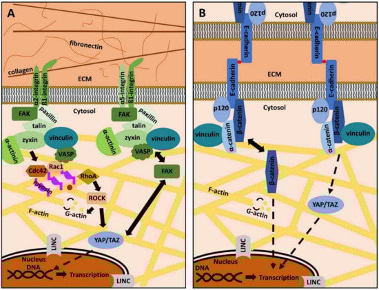 Intracellularly, integrins are linked to various signaling proteins, which function as a molecular clutch that couples integrin–ECM interaction to intracellular biochemical signaling, the centerpiece of MT. Histologically, these integrin-dependent cell-to-matrix connection structures are called FAs [].