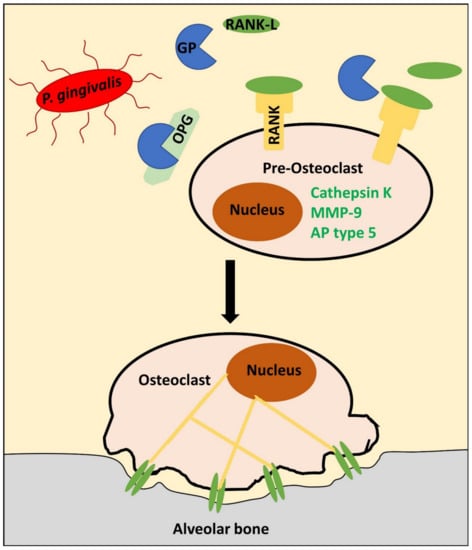 P. gingivalis induces alveolar bone resorption through gingipain proteases. Secreted proteases, so-called gingipains (GPs), from the microbe Porphyromonas gingivalis (P. gingivalis) interact with the receptor activator of nuclear factor kappa-B ligand (RANK-L), osteoprotegerin (OPG), and receptor activator of nuclear factor kappa-B (RANK) system of osteocytes and osteoclasts. In the presence of GPs, OPG is degraded, which favors RANK-L binding to RANK. Consequently, osteoclasts differentiate out of pre-osteoclasts through upregulation of Cathepsin K, matrix metalloproteinase 9 (MMP-9), and alkaline phosphatase type 5 (AP). Subsequently, osteoclasts can bind to the alveolar bone via αVβ3 integrins (green, dimeric sticks), which regulate actin cytoskeletal tension (yellow lines). Altogether, these processes favor alveolar bone resorption within resorption pits. Details are given in the main text.
