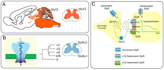 - Zeilhofer, H.U.; Acuña, M.A.; Gingras, J.; Yévenes, G.E. Glycine receptors and glycine transporters: Targets for novel analgesics? Cell Mol. Life. Sci. 2018, 75, 447–465. [Google Scholar] [CrossRef] [PubMed]