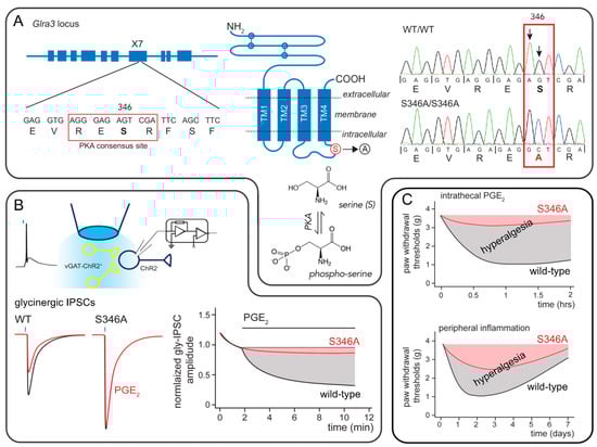 Although the reconstitution experiments in HEK293 cells supported the critical role of a direct PKA-dependent phosphorylation of α3 GlyRs, unequivocal proof for its relevance to in vivo hyperalgesia was still lacking. The recent generation of a genetically engineered S346A point mutated mouse line allowed filling this gap (Figure 2). This mouse carries a serine to alanine amino acid exchange at position 346 (S346A mutation) in the PKA consensus sequence of the GlyR α3 subunit [8]. Electrophysiological recordings from substantia gelatinosa neurons in spinal cord slices of these mice demonstrated not only that the point-mutated α3GlyRs were resistant to inhibition by PGE2 but also confirmed the critical contribution of phosphorylation at this site to inflammatory hyperalgesia. Mice carrying the S346A point mutation were resistant to the hyperalgesic effects of intrathecally injected PGE2 and developed much less hyperalgesia after injection of zymosan A into one hindpaw.