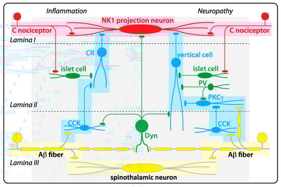 Simplified model of the dorsal horn neuronal circuits of allodynia recruited during inflammation and neuropathy. Under healthy conditions, relay pathways for noxious stimuli (red) and innocuous tactile stimuli (yellow) are strictly separated. Noxious stimuli enter the superficial layers of the dorsal horn via nociceptive C fibers, which activate neurokinin 1 receptor positive (NK1) projection neurons located in lamina I. Tactile input is conveyed by myelinated Aβ fibers, which activate spinothalamic projection neurons in the deep dorsal horn. Polysynaptic connections between both modalities are preexisting (blue) but normally silenced by glycinergic and GABAergic input. In inflammation (left), the pathway starts with cholecystokinin (CCK) positive excitatory interneurons that are activated by Aβ fibers and project to calretinin positive neurons (CR), which then excite NK1 projection neurons in lamina I. In neuropathy, the pathway also begins with cholecystokinin (CCK) positive interneurons, which activate PKCγ positive interneurons. The PKCγ interneurons the project to so-called vertical cells, which connect to lamina I NK1 projection neurons. PKCγ positive neurons can also be directly activated by Aβ fiber input. Several types of inhibitory interneurons (green) silence these polysynaptic pathways, among them are parvalbumin positive (PV) neurons, dynorphin positive interneurons (Dyn), and so-called islet cells. Dyn and PV neurons evoke postsynaptic responses with a strong glycinergic component. About half of the more superficially located islet cells release glycine in addition to GABA. Many of these inhibitory interneurons are activated by input from nociceptors or non-nociceptive Aβ fibers and thereby provide feed-forward inhibition. Schemes are based on [16,17].
