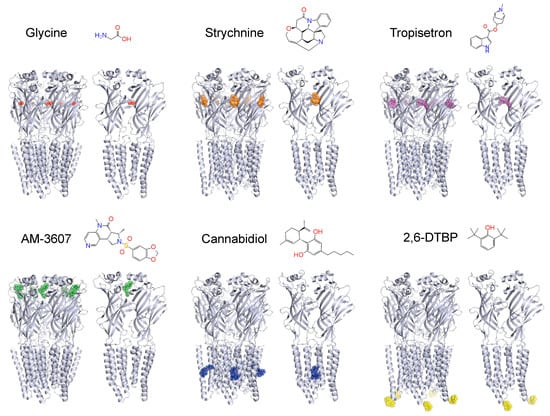 Modulators of α3 GlyRs. Structures of α3 GlyRs bound to the agonist glycine, the competitive antagonist strychnine, or the exogenous modulators tropisetron, AM-3607 (whose chemical structure is very similar to that of AM-1488), 2,6-di-tert-butylphenol (2,6-DTBP) and cannabidiol (CBD). To highlight the relevance of inter-subunit binding sites, models showing the interface of two adjacent α3 subunits are also shown. The interaction of tropisetron with the orthosteric site of α3 GlyRs was modeled according to [44]. The AM-3607 binding site was reconstructed as described in [11]. The models showing the CBD and 2,6-DTBP interaction with α3 GlyRs were generated based on [12,14]. The α3 GlyR structural coordinates (PDB ID: 5TIO and 5CFB) were taken from [11,45].